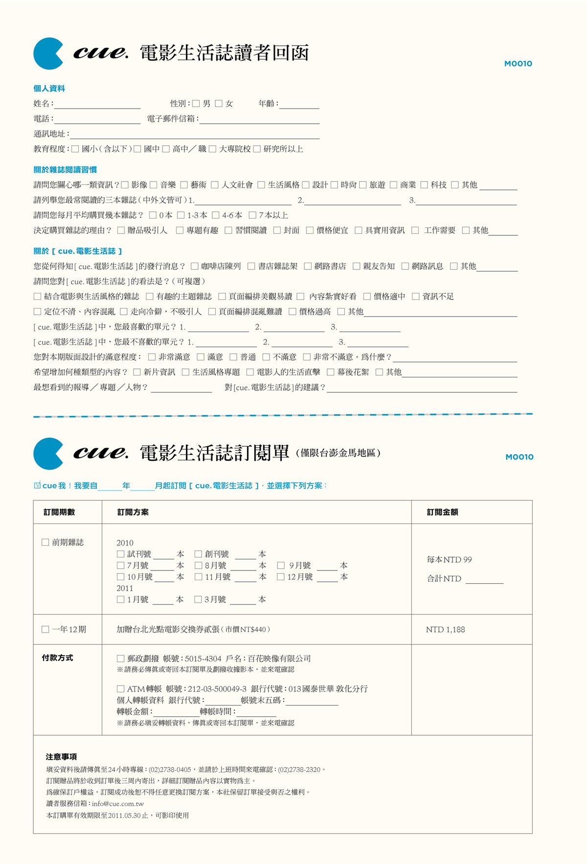 謝謝大家的熱血支持,[cue.電影生活誌]於今年6/1創刊,以月刊形式,為大家在每個月帶來美好的電影生活,並同時開放雜誌訂閱服務,若需訂閱(過刊亦同時開放訂購喔!),請下載[cue.電影生活誌]訂閱單填寫〈詳情請參照訂閱單內容〉。